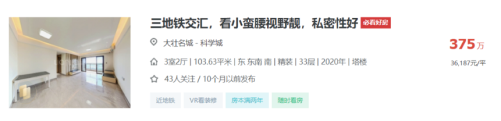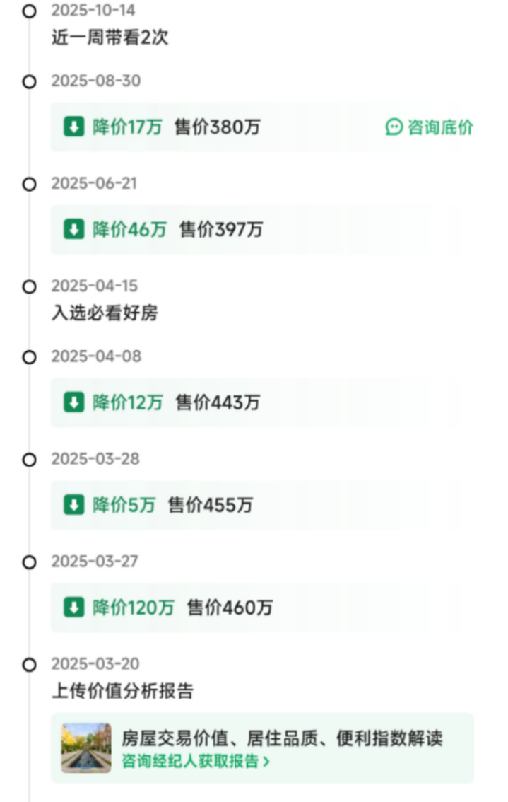 以链家数据为例,同样一套约104平方米房源,去年12月成交价为470万元,折合单价4.5万元/平方米,而到今年10月,有业主挂牌总价回落到了375万元,折合单价约3.61万元/平方米。