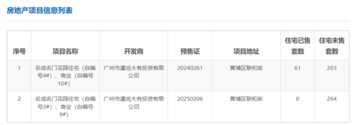 每经记者查阅广州阳光家缘数据了解到,截至10月14日,大壮名城二期(备案名:名成名门花园)住宅未售套数为467套,住宅已售套数为61套,去化率约11.6%。